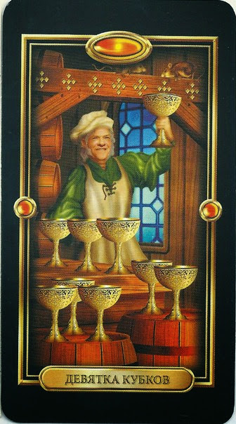 - Девятка Кубков — карта эмоционального удовлетворения, комфорта и "исполнения желаний". Часто ее называют "картой счастья". Вы чувствуете себя благодарным, довольным жизнью, наслаждаетесь ее плодами. Это внутренняя гармония и ощущение, что в эмоциональном плане у вас есть все, что нужно.